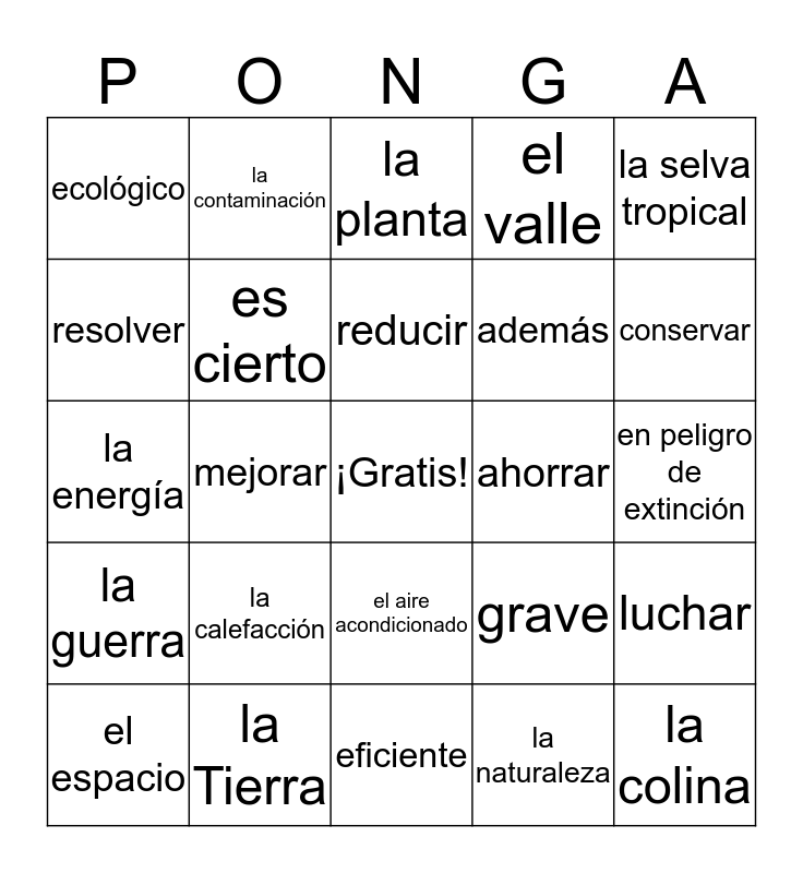 This bingo card has a free space and 44 words: el bosque, la colina, el desierto, el espacio, la luna, la naturaleza, la planta, el pueblo, la selva tropical, la Tierra, el valle, ahorrar, el aire acondicionado, la calefacción, económico, eficiente, la electricidad, la energía, solar, conservar, la contaminación, contra, la destrucción, ecológico, eliminar, en peligro de extinción, la fuente, funcionar, grave, la guerra, juntarse, luchar, la manera, el medio ambiente, mejorar, la paz, proteger, puro, reducir, resolver, además, dudar, es cierto and haya.