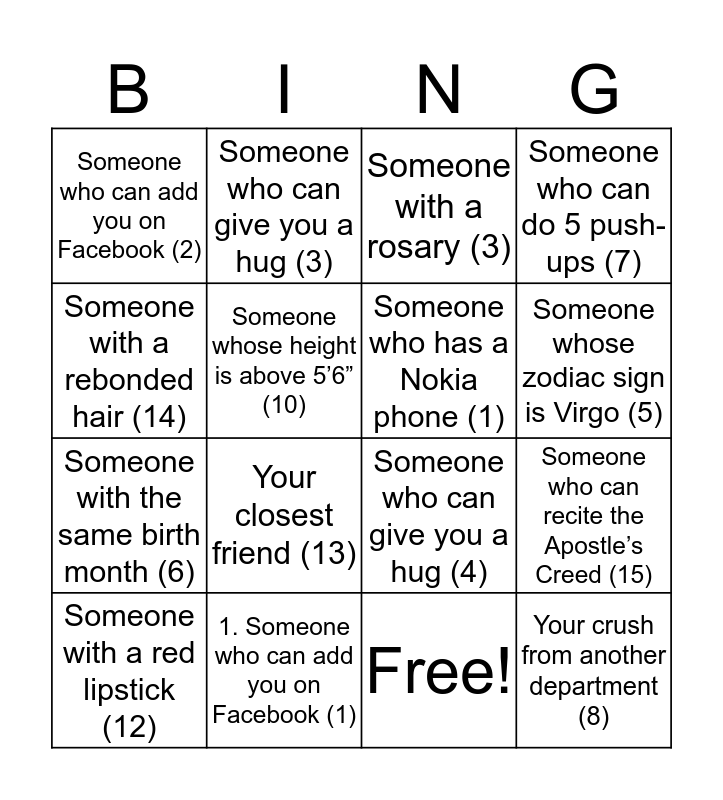 This bingo card has 21 words: 1. Someone who can add you on Facebook (1), Someone with a rosary (2), Someone who can give you a hug (3), Someone whose zodiac sign is Virgo (4), Free!, Someone who has a Nokia phone (1), Someone who can add you on Facebook (2), Someone with a rosary (3), Someone who can give you a hug (4), Someone whose zodiac sign is Virgo (5), Someone with the same birth month (6), Someone who can do 5 push-ups (7), Your crush from another department (8), …Recite the multiplication table of 9 (9), Someone whose height is above 5’6” (10), Someone who is an only child (11), Someone with a red lipstick (12), Your closest friend (13), Someone with a rebonded hair (14), Someone who can recite the Apostle’s Creed (15) and Someone who can sing your favorite song (16).