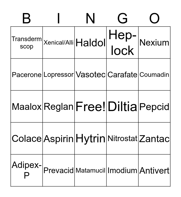 This bingo card has a free space and 24 words: Adipex-P, Aspirin, Vasotec, Imodium, Nexium, Transderm scop, Xenical/Alli, Haldol, Diltia, Pepcid, Maalox, Lopressor, Nitrostat, Zantac, Pacerone, Prevacid, Matamucil, Hep-lock, Coumadin, Colace, Reglan, Hytrin, Carafate and Antivert.