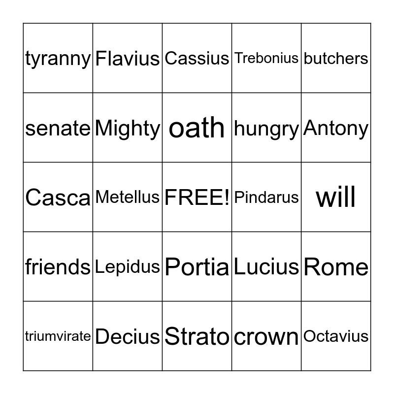 This bingo card has a free space and 24 words: Lepidus, Decius, oath, triumvirate, butchers, tyranny, senate, Flavius, Pindarus, Portia, hungry, Casca, Lucius, Rome, Mighty, crown, will, Cassius, Antony, Metellus, Octavius, friends, Trebonius and Strato.