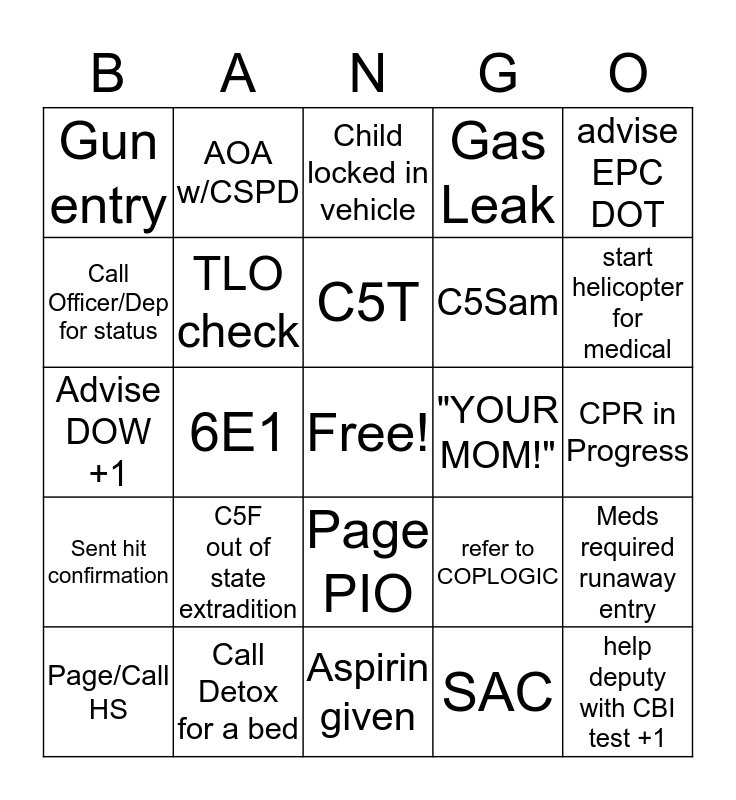 This bingo card has a free space and 24 words: C5F out of state extradition, Call Detox for a bed, C5T, Page/Call HS, advise EPC DOT, Gun entry, Call Officer/Dep for status, AOA w/CSPD, "YOUR MOM!", Page PIO, C5Sam, Advise DOW +1, refer to COPLOGIC, Meds required runaway entry, TLO check, SAC, CPR in Progress, Child locked in vehicle, start helicopter for medical, 6E1, help deputy with CBI test +1, Sent hit confirmation, Gas Leak and Aspirin given.