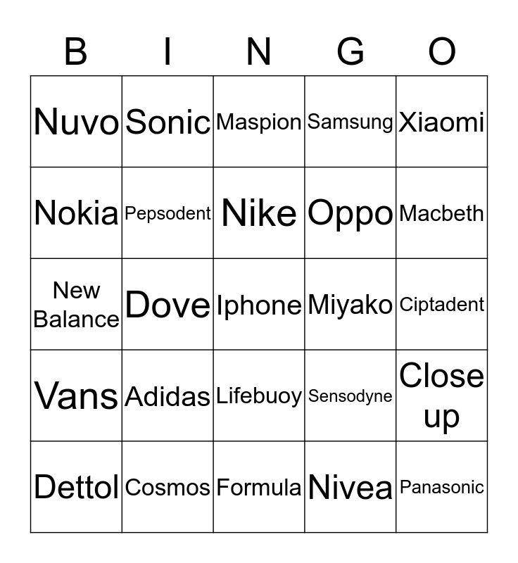 This bingo card has a free space and 24 words: Adidas, Cosmos, Nike, Dettol, Xiaomi, Nuvo, Nokia, Sonic, Miyako, Lifebuoy, Oppo, New Balance, Sensodyne, Close up, Pepsodent, Nivea, Ciptadent, Maspion, Macbeth, Dove, Panasonic, Vans, Samsung and Formula.