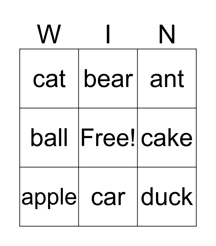 This bingo card has a free space and 9 words: apple, ant, bear, ball, cat, cake, duck, dog and car.
