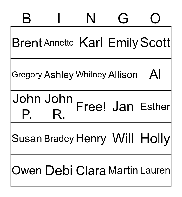 This bingo card has a free space and 24 words: Bradey, Debi, Whitney, Owen, Scott, Brent, Gregory, Annette, Jan, Henry, Allison, John P., Will, Holly, Ashley, Martin, Esther, Karl, Al, John R., Lauren, Susan, Emily and Clara.
