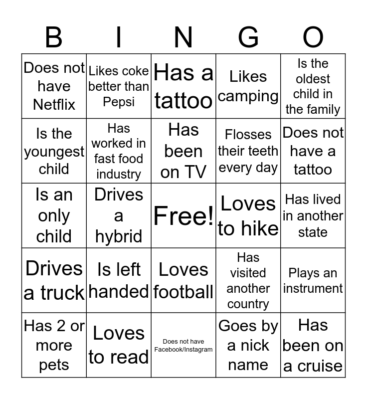 This bingo card has a free space and 24 words: Is left handed, Loves to read, Has been on TV, Has 2 or more pets, Is the oldest child in the family, Does not have Netflix, Is the youngest child, Likes coke better than Pepsi, Loves to hike, Loves football, Flosses their teeth every day, Is an only child, Has visited another country, Plays an instrument, Has worked in fast food industry, Goes by a nick name, Has lived in another state, Has a tattoo, Does not have a tattoo, Drives a hybrid, Has been on a cruise, Drives a truck, Likes camping and Does not have Facebook/Instagram.
