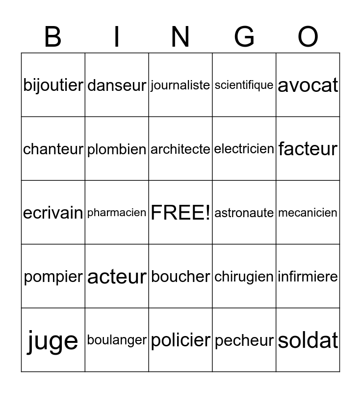 This bingo card has a free space and 24 words: acteur, boulanger, architecte, juge, avocat, bijoutier, chanteur, danseur, astronaute, boucher, electricien, ecrivain, chirugien, infirmiere, plombien, pecheur, mecanicien, journaliste, facteur, pharmacien, soldat, pompier, scientifique and policier.