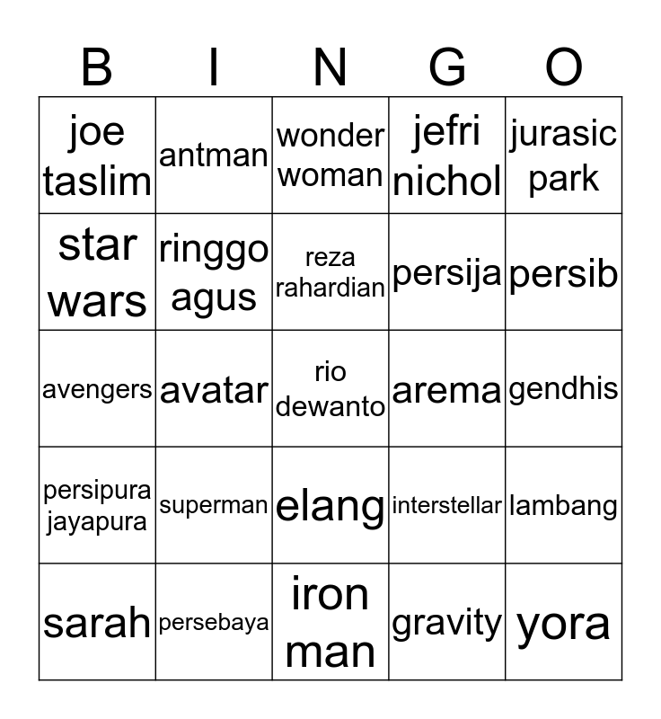 This bingo card has a free space and 24 words: superman, persebaya, reza rahardian, sarah, jurasic park, joe taslim, star wars, antman, arema, elang, persija, avengers, interstellar, lambang, ringgo agus, gravity, gendhis, wonder woman, persib, avatar, yora, persipura jayapura, jefri nichol and iron man.