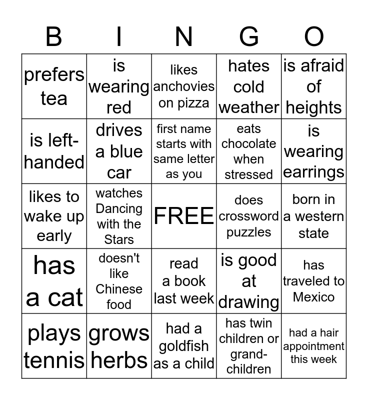 This bingo card has a free space and 24 words: doesn't like Chinese food, grows herbs, first name starts with same letter as you, plays tennis, is afraid of heights, prefers tea, is left-handed, is wearing red, does crossword puzzles, read a book last week, eats chocolate when stressed, likes to wake up early, is good at drawing, has traveled to Mexico, drives a blue car, has twin children or grand-children, born in a western state, likes anchovies on pizza, is wearing earrings, watches Dancing with the Stars, had a hair appointment this week, has a cat, hates cold weather and had a goldfish as a child.