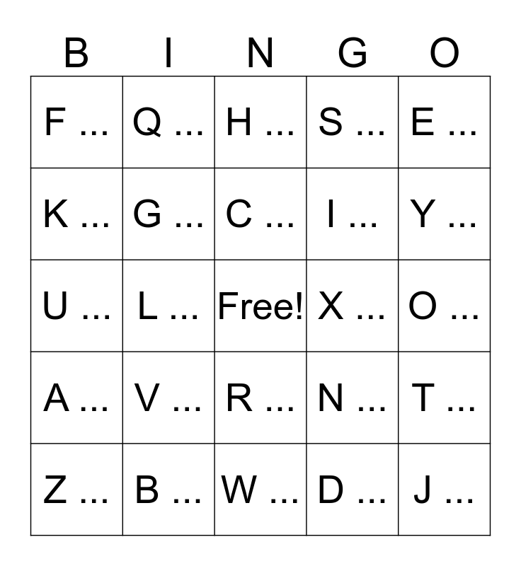 This bingo card has a free space and 26 words: A ..., B ..., C ..., D ..., E ..., F ..., G ..., H ..., I ..., J ..., K ..., L ..., M ..., N ..., O ..., P ..., Q ..., R ..., S ..., T ..., U ..., V ..., W ..., X ..., Y ... and Z ....