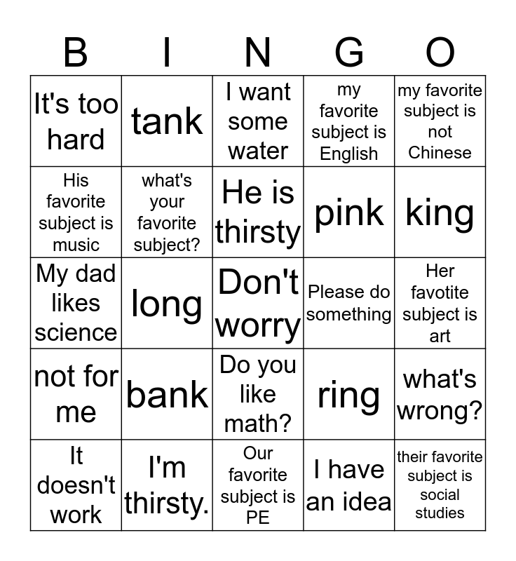 This bingo card has a free space and 24 words: bank, I'm thirsty., He is thirsty, It doesn't work, my favorite subject is not Chinese, It's too hard, His favorite subject is music, tank, Please do something, Do you like math?, pink, My dad likes science, ring, what's wrong?, what's your favorite subject?, I have an idea, Her favotite subject is art, I want some water, king, long, their favorite subject is social studies, not for me, my favorite subject is English and Our favorite subject is PE.