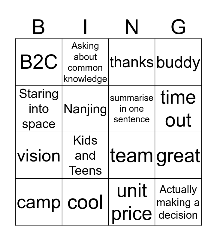 This bingo card has 16 words: cool, great, thanks, B2C, vision, Asking about common knowledge, team, unit price, Staring into space, Nanjing, camp, buddy, Kids and Teens, time out, summarise in one sentence and Actually making a decision.
