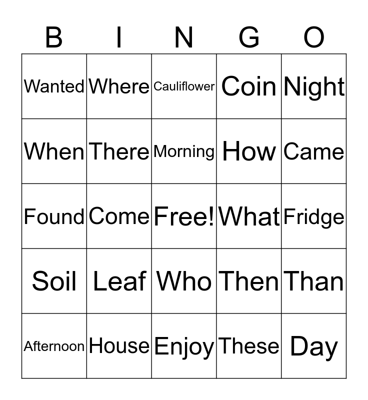 This bingo card has a free space and 24 words: Leaf, House, Morning, Afternoon, Night, Wanted, When, Where, What, Who, How, Found, Then, Than, There, These, Fridge, Cauliflower, Came, Come, Day, Soil, Coin and Enjoy.
