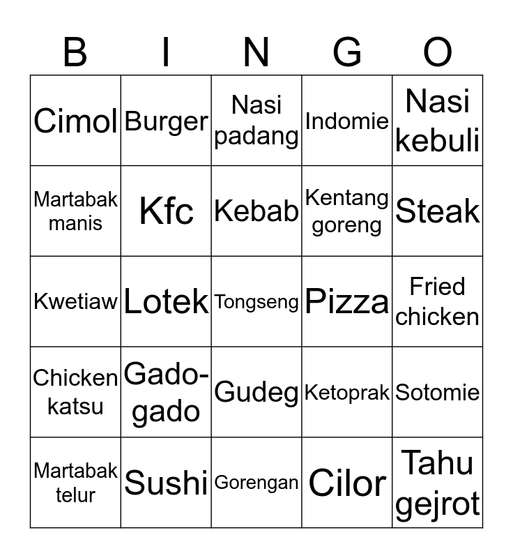 This bingo card has a free space and 24 words: Gado-gado, Sushi, Kebab, Martabak telur, Nasi kebuli, Cimol, Martabak manis, Burger, Pizza, Gudeg, Kentang goreng, Kwetiaw, Ketoprak, Sotomie, Kfc, Cilor, Fried chicken, Nasi padang, Steak, Lotek, Tahu gejrot, Chicken katsu, Indomie and Gorengan.