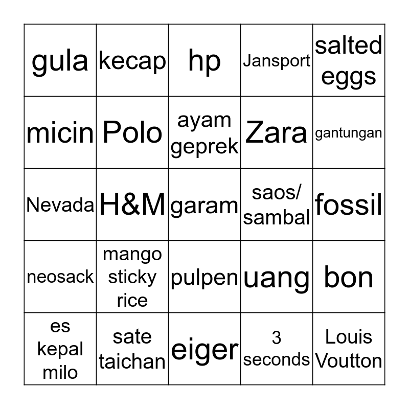 This bingo card has a free space and 24 words: mango sticky rice, sate taichan, ayam geprek, es kepal milo, salted eggs, gula, micin, kecap, saos/ sambal, pulpen, Zara, Nevada, uang, bon, Polo, 3 seconds, fossil, hp, gantungan, H&M, Louis Voutton, neosack, Jansport and eiger.