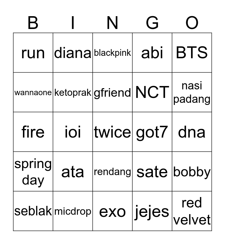 This bingo card has a free space and 24 words: ata, micdrop, gfriend, seblak, BTS, run, wannaone, diana, got7, rendang, NCT, fire, sate, bobby, ketoprak, jejes, dna, blackpink, nasi padang, ioi, red velvet, spring day, abi and exo.