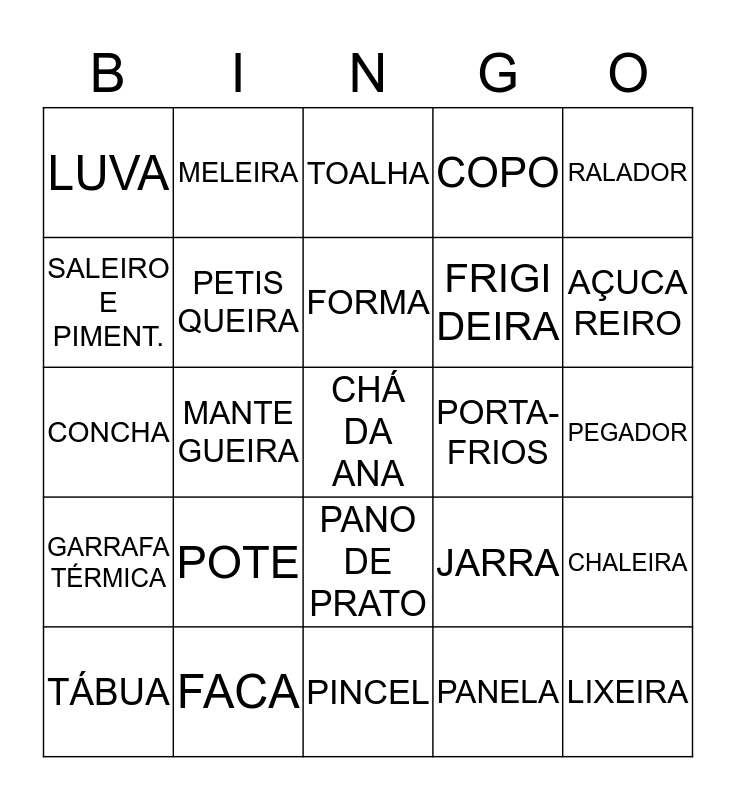 This bingo card has a free space and 24 words: POTE, FACA, FORMA, TÁBUA, RALADOR, LUVA, SALEIRO E PIMENT., MELEIRA, PORTA- FRIOS, PANO DE PRATO, FRIGI DEIRA, CONCHA, JARRA, CHALEIRA, PETIS QUEIRA, PANELA, PEGADOR, TOALHA, AÇUCA REIRO, MANTE GUEIRA, LIXEIRA, GARRAFA TÉRMICA, COPO and PINCEL.