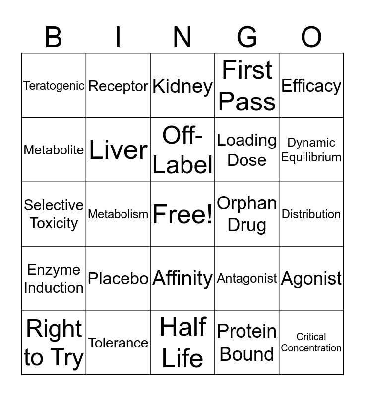 This bingo card has a free space and 24 words: Placebo, Tolerance, Off-Label, Right to Try, Efficacy, Teratogenic, Metabolite, Receptor, Orphan Drug, Affinity, Loading Dose, Selective Toxicity, Antagonist, Agonist, Liver, Protein Bound, Distribution, Kidney, Dynamic Equilibrium, Metabolism, Critical Concentration, Enzyme Induction, First Pass and Half Life.