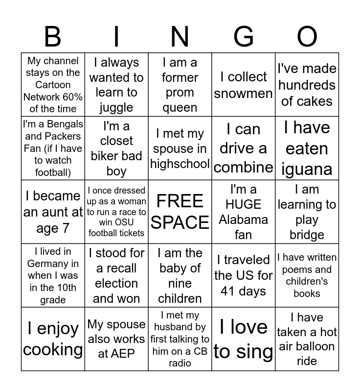 This bingo card has a free space and 24 words: I stood for a recall election and won, My spouse also works at AEP, I met my spouse in highschool, I enjoy cooking, I've made hundreds of cakes, My channel stays on the Cartoon Network 60% of the time, I'm a Bengals and Packers Fan (if I have to watch football), I always wanted to learn to juggle, I'm a HUGE Alabama fan, I am the baby of nine children, I can drive a combine, I became an aunt at age 7, I traveled the US for 41 days, I have written poems and children's books, I'm a closet biker bad boy, I love to sing, I am learning to play bridge, I am a former prom queen, I have eaten iguana, I once dressed up as a woman to run a race to win OSU football tickets, I have taken a hot air balloon ride, I lived in Germany in when I was in the 10th grade, I collect snowmen and I met my husband by first talking to him on a CB radio.