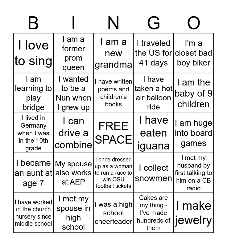 This bingo card has a free space and 24 words: My spouse also works at AEP, I met my spouse in high school, I have written poems and children's books, I have worked in the church nursery since middle school, I'm a closet bad boy biker, I love to sing, I am learning to play bridge, I am a former prom queen, I have eaten iguana, I once dressed up as a woman to run a race to win OSU football tickets, I have taken a hot air balloon ride, I lived in Germany when I was in the 10th grade, I collect snowmen, I met my husband by first talking to him on a CB radio, I wanted to be a Nun when I grew up, Cakes are my thing - I've made hundreds of them, I am huge into board games, I am a new grandma, I am the baby of 9 children, I can drive a combine, I make jewelry, I became an aunt at age 7, I traveled the US for 41 days and I was a high school cheerleader.