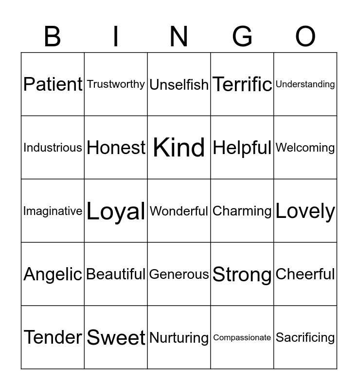 This bingo card has 25 words: Beautiful, Nurturing, Kind, Tender, Understanding, Patient, Industrious, Trustworthy, Charming, Generous, Helpful, Imaginative, Strong, Cheerful, Honest, Sacrificing, Lovely, Unselfish, Welcoming, Loyal, Wonderful, Sweet, Angelic, Terrific and Compassionate.