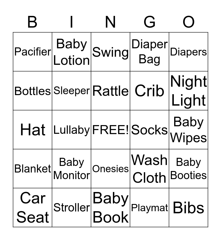 This bingo card has a free space and 24 words: Baby Monitor, Stroller, Rattle, Car Seat, Diapers, Pacifier, Bottles, Baby Lotion, Socks, Onesies, Crib, Hat, Wash Cloth, Baby Booties, Sleeper, Playmat, Baby Wipes, Swing, Night Light, Lullaby, Bibs, Blanket, Diaper Bag and Baby Book.