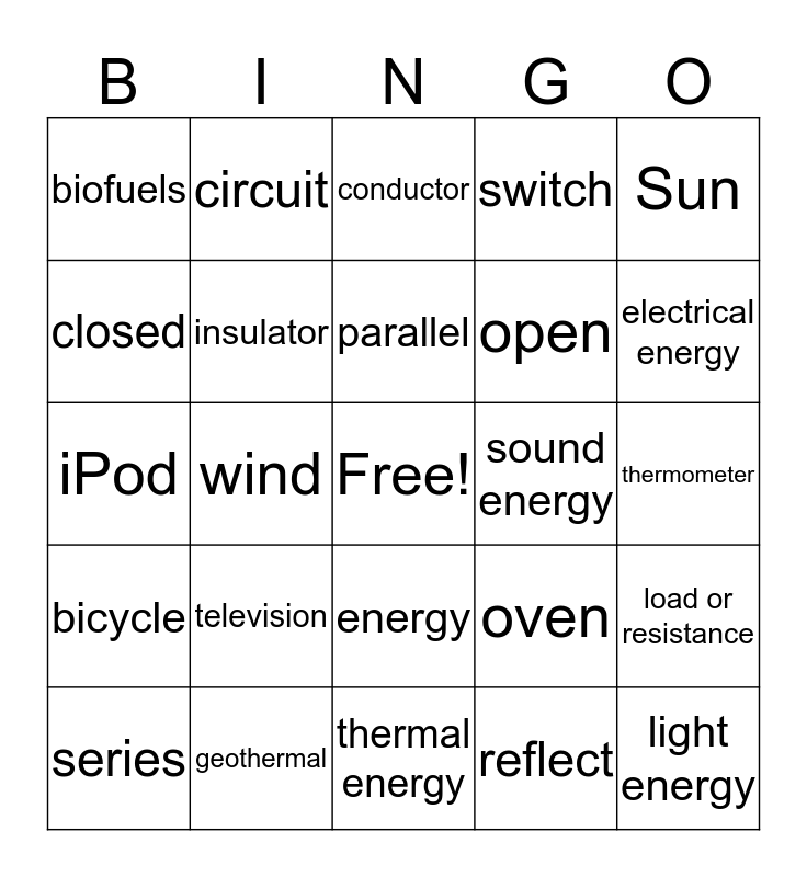 This bingo card has a free space and 30 words: geothermal, solar, wind, hydroelectric, biofuels, conductor, insulator, energy, sound energy, thermal energy, thermometer, light energy, reflect, refract, electrical energy, mechanical energy, oven, bicycle, television, Sun, iPod, magnetism, circuit, open, closed, switch, load or resistance, series, parallel and transmit.