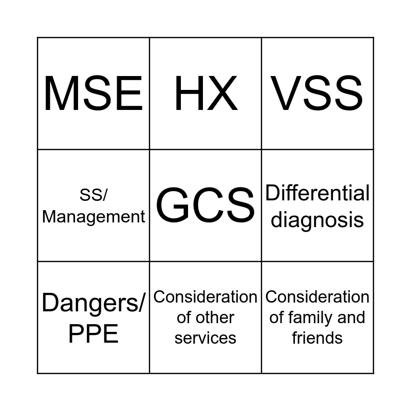 This bingo card has 9 words: Dangers/ PPE, GCS, VSS, MSE, HX, Differential diagnosis, SS/ Management, Consideration of other services and Consideration of family and friends.