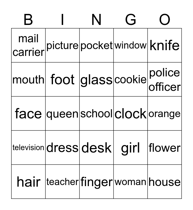 This bingo card has 25 words: dress, finger, glass, hair, knife, mail carrier, mouth, picture, clock, desk, cookie, face, girl, flower, foot, house, orange, pocket, police officer, queen, school, teacher, television, window and woman.