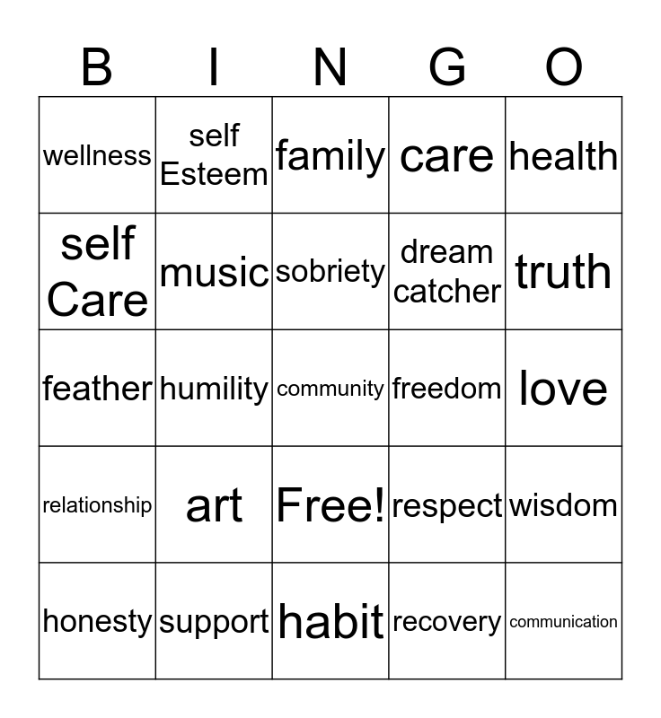 This bingo card has 26 words: Free!, recovery, sobriety, support, health, wellness, self Care, self Esteem, love, respect, dream catcher, feather, wisdom, honesty, humility, courage, care, relationship, family, community, truth, habit, freedom, art, music and communication.