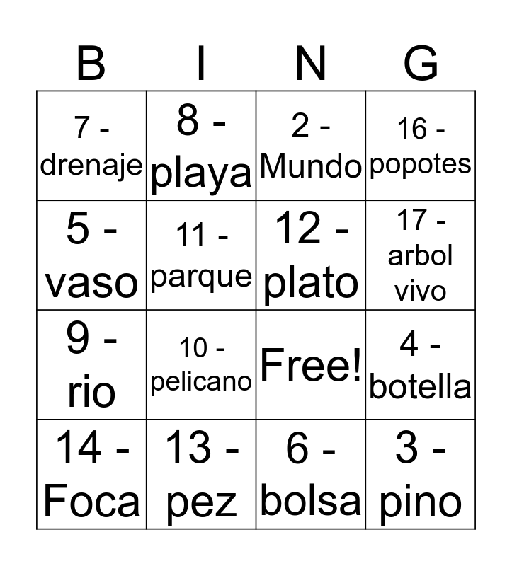 This bingo card has 19 words: Free!, 1 - Mar, 2 -Mundo, 3 - pino, 4 - botella, 5 - vaso, 6 - bolsa, 7 - drenaje, 8 - playa, 9 - rio, 10 - pelicano, 11 - parque, 12 - plato, 13 - pez, 14 - Foca, 15 - Tortuga, 16 - popotes, 17 - arbol vivo and 18 - utensilios.