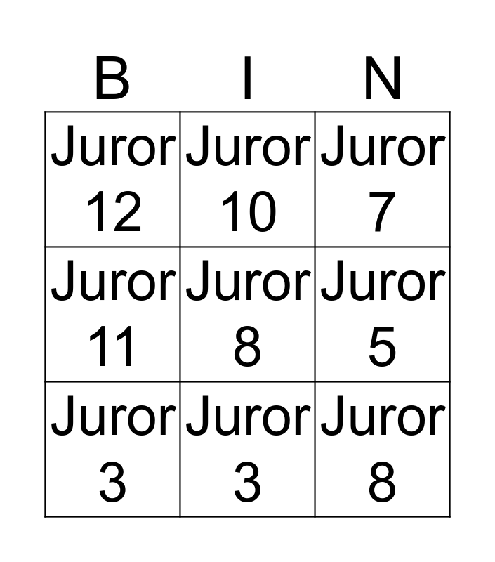 This bingo card has a free space and 8 words: Juror 5, Juror 7, Juror 10, Juror 3, Juror 12, Juror 8, Juror 11 and Juror 3.