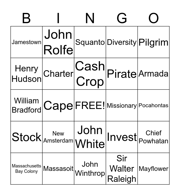 This bingo card has a free space and 36 words: Claim, Invasion, Parallel timelines, Charter, Invest, Stock, Cash Crop, Indentured Servant, Pilgrim, Compact, Cape, Diversity, Tolerance, Missionary, Armada, Jamestown, Colonies, New Amsterdam, Mayflower, Squanto, Pocahontas, Chief Powhatan, Massasoit, Massachusetts Bay Colony, John Winthrop, John Rolfe, William Bradford, Captain John Smith, Pirate, Henry Hudson, Champlain, Francis Drake, Sir Walter Raleigh, John White, John Cabot and Giovanni da Verrazano.