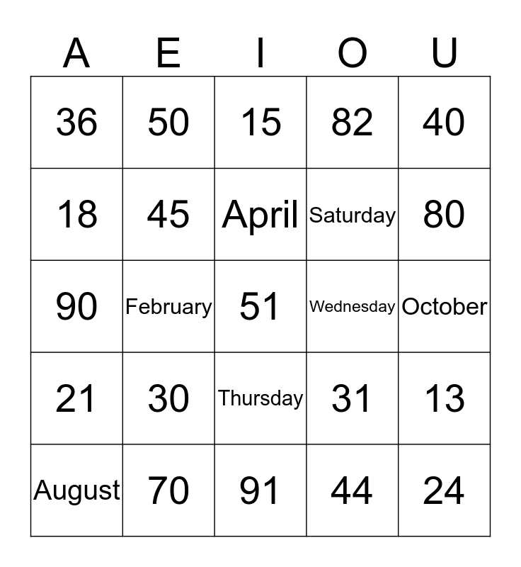 This bingo card has 34 words: 24, 44, January, Tuesday, 21, 45, 40, August, 50, 60, April, 15, 11, Sunday, Wednesday, 80, 70, 90, 30, 31, Thursday, 34, 36, October, 91, 51, 82, 17, Saturday, 18, 19, February, 13 and 12.