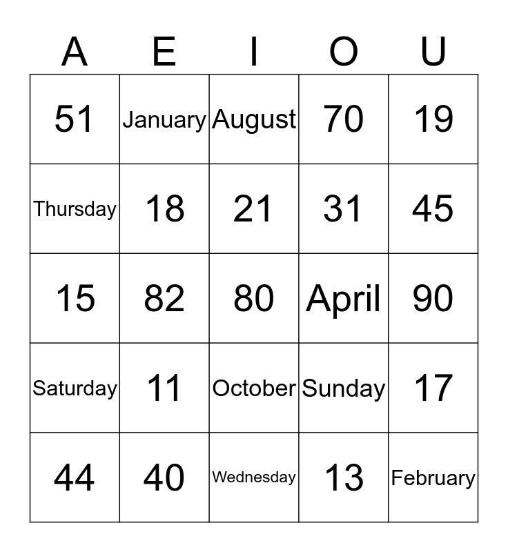This bingo card has 34 words: February, 13, 12, 24, Saturday, 18, 19, 44, January, Tuesday, 21, August, 50, 60, April, 45, 40, 15, 11, Sunday, October, 91, 51, 90, Wednesday, 80, 70, 30, 31, Thursday, 36, 82, 17 and 34.