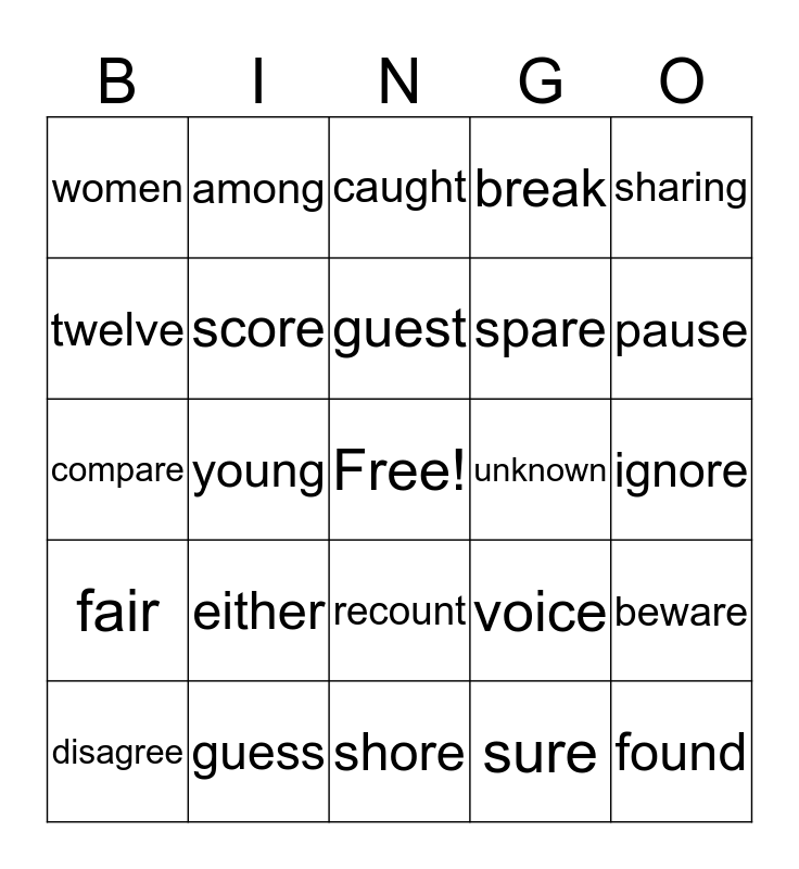 This bingo card has a free space and 24 words: either, guess, guest, disagree, sharing, women, twelve, among, unknown, recount, spare, compare, voice, beware, score, sure, ignore, caught, pause, young, found, fair, break and shore.