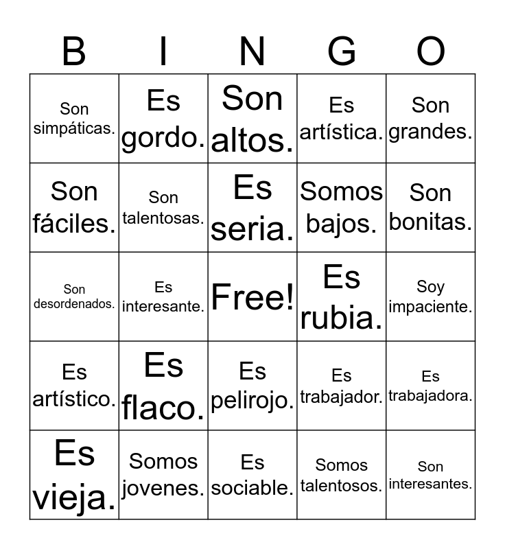 This bingo card has a free space and 24 words: Es flaco., Somos jovenes., Es seria., Es vieja., Son grandes., Son simpáticas., Son fáciles., Es gordo., Es rubia., Es pelirojo., Somos bajos., Son desordenados., Es trabajador., Es trabajadora., Son talentosas., Somos talentosos., Soy impaciente., Son altos., Son bonitas., Es interesante., Son interesantes., Es artístico., Es artística. and Es sociable..