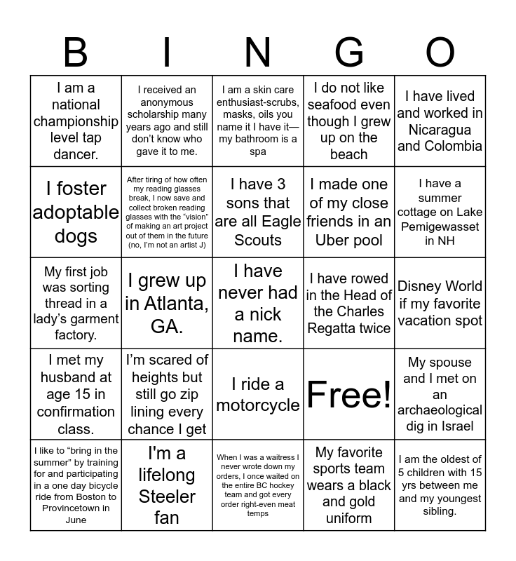 This bingo card has 25 words: I’m scared of heights but still go zip lining every chance I get, When I was a waitress I never wrote down my orders, I once waited on the entire BC hockey team and got every order right-even meat temps, I have 3 sons that are all Eagle Scouts, I like to “bring in the summer” by training for and participating in a one day bicycle ride from Boston to Provincetown in June, I have lived and worked in Nicaragua and Colombia, I am a national championship level tap dancer., I foster adoptable dogs, I received an anonymous scholarship many years ago and still don’t know who gave it to me., I have rowed in the Head of the Charles Regatta twice, I ride a motorcycle, I made one of my close friends in an Uber pool, My first job was sorting thread in a lady’s garment factory., Free!, My spouse and I met on an archaeological dig in Israel, After tiring of how often my reading glasses break, I now save and collect broken reading glasses with the “vision” of making an art project out of them in the future (no, I’m not an artist J), I am the oldest of 5 children with 15 yrs between me and my youngest sibling., Disney World if my favorite vacation spot, I am a skin care enthusiast-scrubs, masks, oils you name it I have it—my bathroom is a spa, I have a summer cottage on Lake Pemigewasset in NH, I grew up in Atlanta, GA., I have never had a nick name., I'm a lifelong Steeler fan, I met my husband at age 15 in confirmation class., I do not like seafood even though I grew up on the beach and My favorite sports team wears a black and gold uniform.