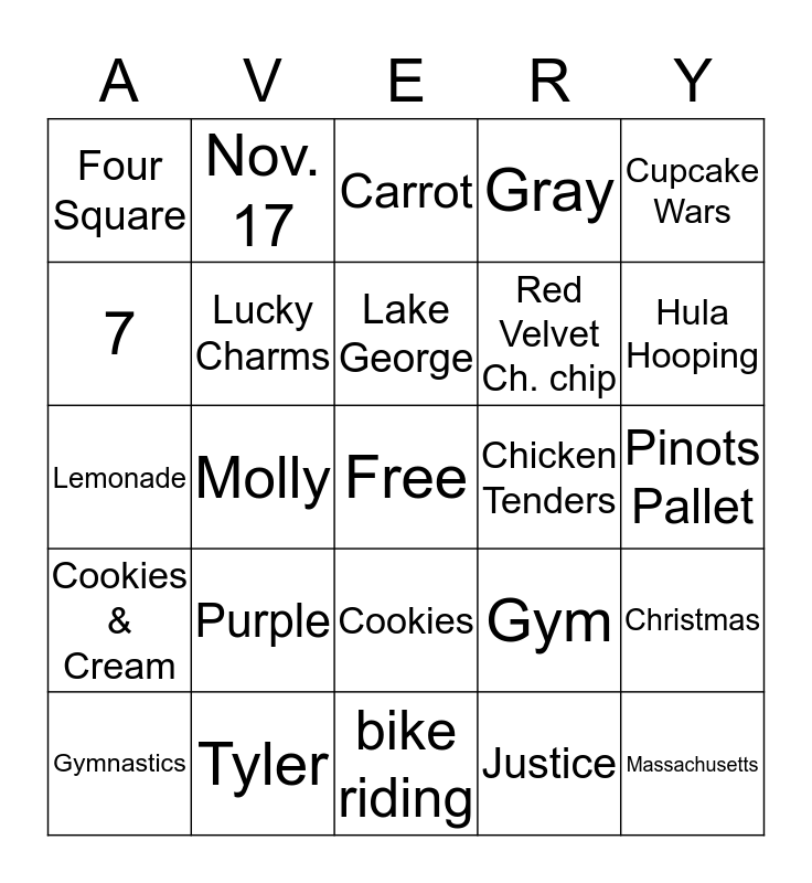 This bingo card has a free space and 24 words: Purple, Tyler, Lake George, Gymnastics, Cupcake Wars, Four Square, 7, Nov. 17, Chicken Tenders, Cookies, Red Velvet Ch. chip, Lemonade, Gym, Christmas, Lucky Charms, Justice, Pinots Pallet, Carrot, Hula Hooping, Molly, Massachusetts, Cookies & Cream, Gray and bike riding.