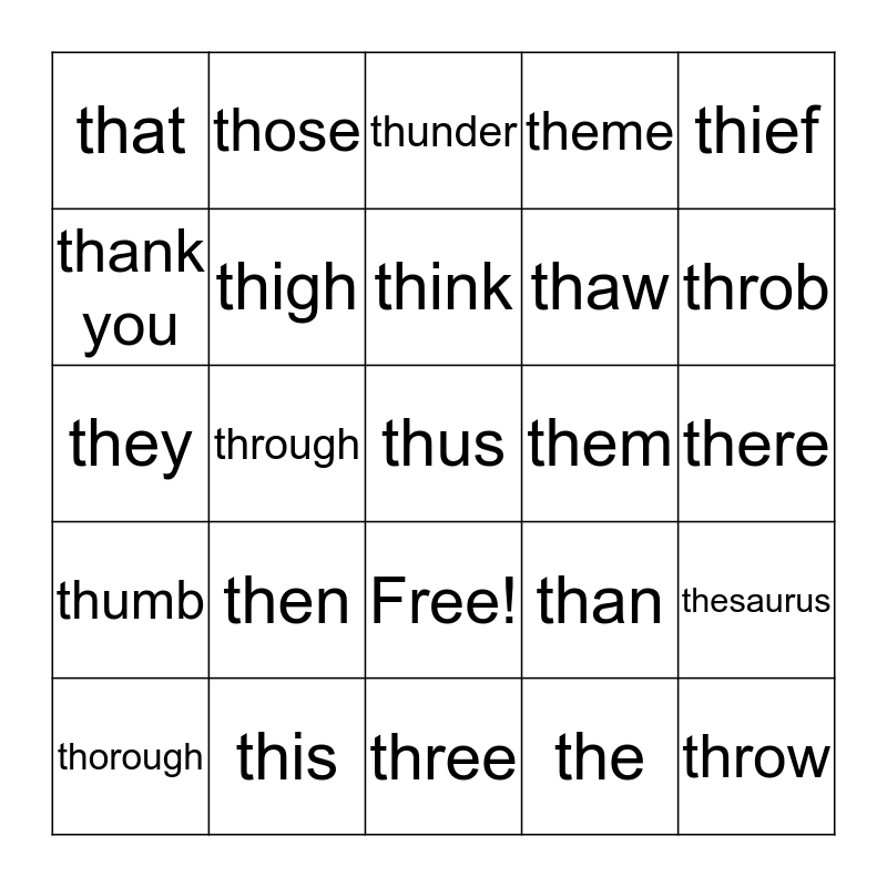 This bingo card has 26 words: Free!, the, think, this, thief, that, thank you, those, there, than, thaw, they, thesaurus, thorough, through, theater, theme, thumb, thunder, thus, throb, three, them, then, thigh and throw.