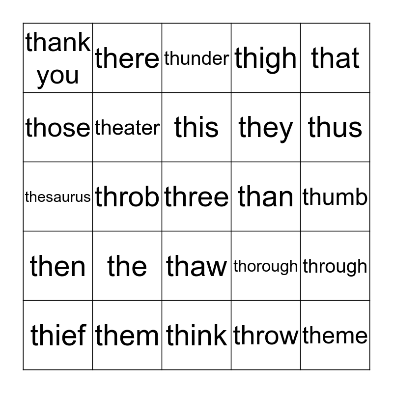 This bingo card has 25 words: the, think, this, thief, that, thank you, those, there, than, thaw, they, thesaurus, thorough, through, theater, theme, thumb, thunder, thus, throb, three, them, then, thigh and throw.