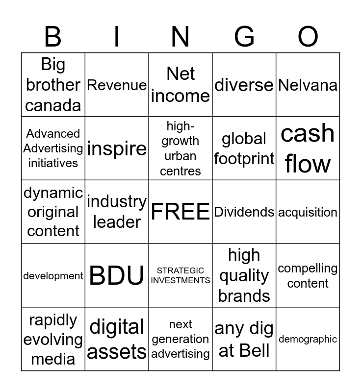 This bingo card has a free space and 51 words: innovation, demographic, programmatic, next generation advertising, BDU, EBITDA, Revenue, synergy, Advanced Advertising initiatives, engage, inspire, diverse, compelling content, high quality brands, interactive, 12 of the Top 20, high-growth urban centres, Dividends, portfolio, Nelvana, industry leader, any dig at Bell, Big brother canada, global footprint, premium brands, Consolidated, cash flow, strategic, rapidly evolving media, Net income, platform, compelling, Video on Demand, multi-platform apps, multimedia, digital assets, long-term goals, Shaw Media, great storytelling, interactive, acquisition, development, resonate, Canadian original content, exceptional lineup, international distribution, dynamic original content, audience, 18-54, STRATEGIC INVESTMENTS and optimize.