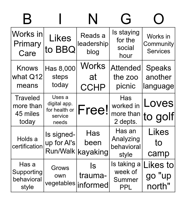 This bingo card has a free space and 24 words: Is signed-up for Al's Run/Walk, Grows own vegetables, Works at CCHP, Has a Supporting behavioral style, Works in Community Services, Works in Primary Care, Knows what Q12 means, Likes to BBQ, Has worked in more than 2 depts., Has been kayaking, Attended the zoo picnic, Traveled more than 45 miles today, Has an Analyzing behavioral style, Likes to camp, Has 8,000 steps today, Is taking a week of Summer PPL, Loves to golf, Reads a leadership blog, Speaks another language, Uses a digital app. for health or service needs, Likes to go "up north", Holds a certification, Is staying for the social hour and Is trauma-informed.