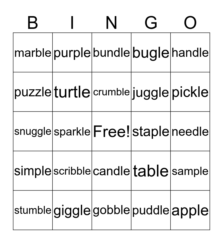 This bingo card has a free space and 24 words: scribble, giggle, crumble, stumble, handle, marble, puzzle, purple, staple, candle, juggle, snuggle, table, sample, turtle, puddle, needle, bundle, pickle, sparkle, apple, simple, bugle and gobble.