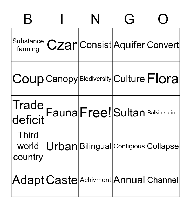 This bingo card has a free space and 24 words: Urban, Caste, Biodiversity, Adapt, Convert, Substance farming, Coup, Czar, Sultan, Bilingual, Culture, Trade deficit, Contigious, Collapse, Canopy, Annual, Balkinisation, Consist, Flora, Fauna, Channel, Third world country, Aquifer and Achivment.