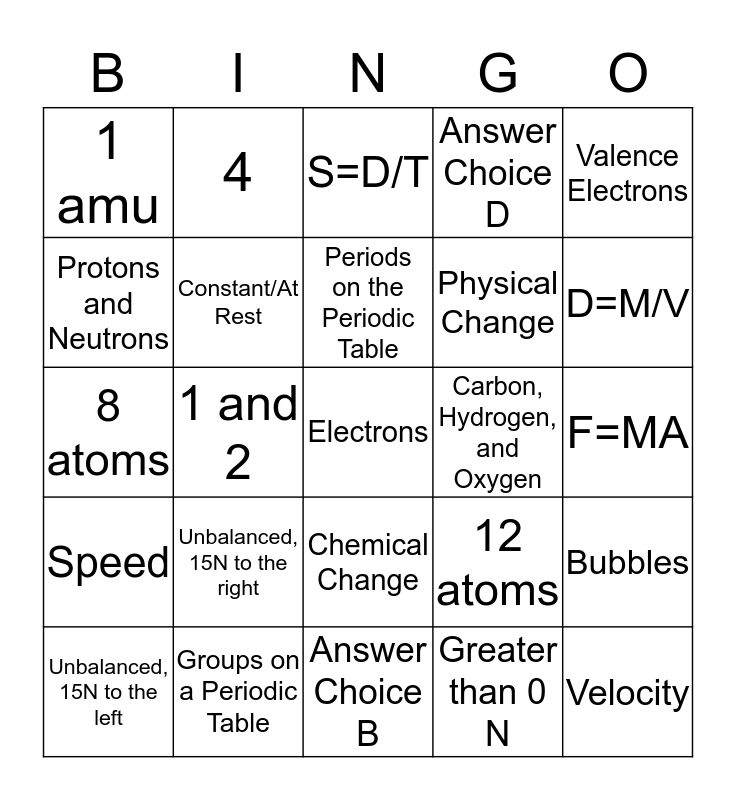 This bingo card has a free space and 24 words: Unbalanced, 15N to the right, Groups on a Periodic Table, Periods on the Periodic Table, Unbalanced, 15N to the left, Valence Electrons, 1 amu, Protons and Neutrons, 4, Carbon, Hydrogen, and Oxygen, Chemical Change, Physical Change, 8 atoms, 12 atoms, Bubbles, Constant/At Rest, Greater than 0 N, F=MA, S=D/T, D=M/V, 1 and 2, Velocity, Speed, Answer Choice D and Answer Choice B.