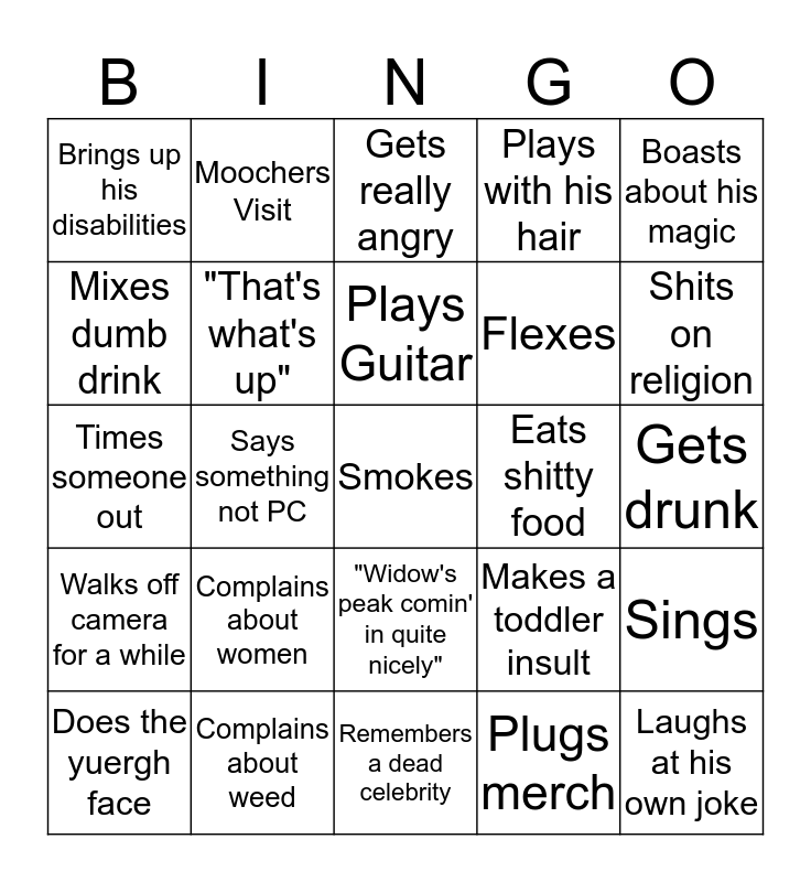 This bingo card has a free space and 24 words: Complains about women, Complains about weed, Plays Guitar, Does the yuergh face, Boasts about his magic, Brings up his disabilities, Mixes dumb drink, Moochers Visit, Eats shitty food, "Widow's peak comin' in quite nicely", Flexes, Times someone out, Makes a toddler insult, Sings, "That's what's up", Plugs merch, Gets drunk, Gets really angry, Shits on religion, Says something not PC, Laughs at his own joke, Walks off camera for a while, Plays with his hair and Remembers a dead celebrity.
