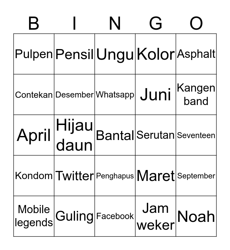 This bingo card has 25 words: Twitter, Facebook, Whatsapp, Mobile legends, Asphalt, Pulpen, Contekan, Pensil, Serutan, Penghapus, Juni, April, Maret, September, Desember, Noah, Seventeen, Ungu, Kangen band, Hijau daun, Bantal, Guling, Kondom, Kolor and Jam weker.