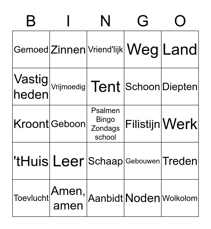This bingo card has a free space and 24 words: Leer, Amen, amen, Tent, Toevlucht, Land, Gemoed, Vastig heden, Zinnen, Filistijn, Schaap, Schoon, Kroont, Gebouwen, Treden, Vrijmoedig, Noden, Werk, Vriend'lijk, Diepten, Geboon, Wolkolom, 'tHuis, Weg and Aanbidt.