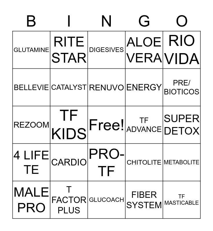 This bingo card has a free space and 24 words: CARDIO, T FACTOR PLUS, RENUVO, MALE PRO, RIO VIDA, GLUTAMINE, BELLEVIE, RITE STAR, TF ADVANCE, PRO-TF, ENERGY, REZOOM, CHITOLITE, METABOLITE, CATALYST, FIBER SYSTEM, SUPER DETOX, DIGESIVES, PRE/ BIOTICOS, TF KIDS, TF MASTICABLE, 4 LIFE TE, ALOE VERA and GLUCOACH.
