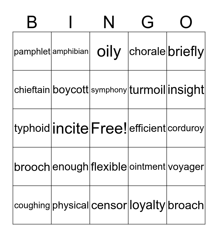 This bingo card has a free space and 24 words: enough, physical, symphony, coughing, briefly, pamphlet, chieftain, amphibian, efficient, flexible, turmoil, typhoid, ointment, voyager, boycott, loyalty, corduroy, oily, insight, incite, broach, brooch, chorale and censor.